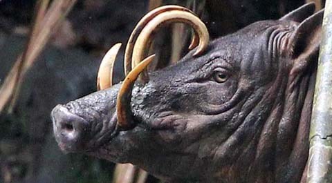 Kỳ lạ loài lợn có nanh cong vút và cặp sừng trên đầu